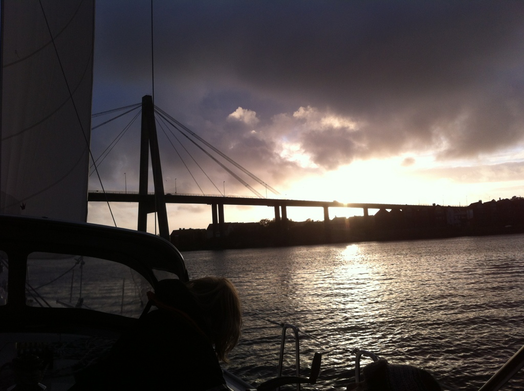 Sola skinte opp da vi seilte innover igjen ved 21-tiden. Vi kom oss nesten helt fram til fortøyningsstedet med vindkraft.